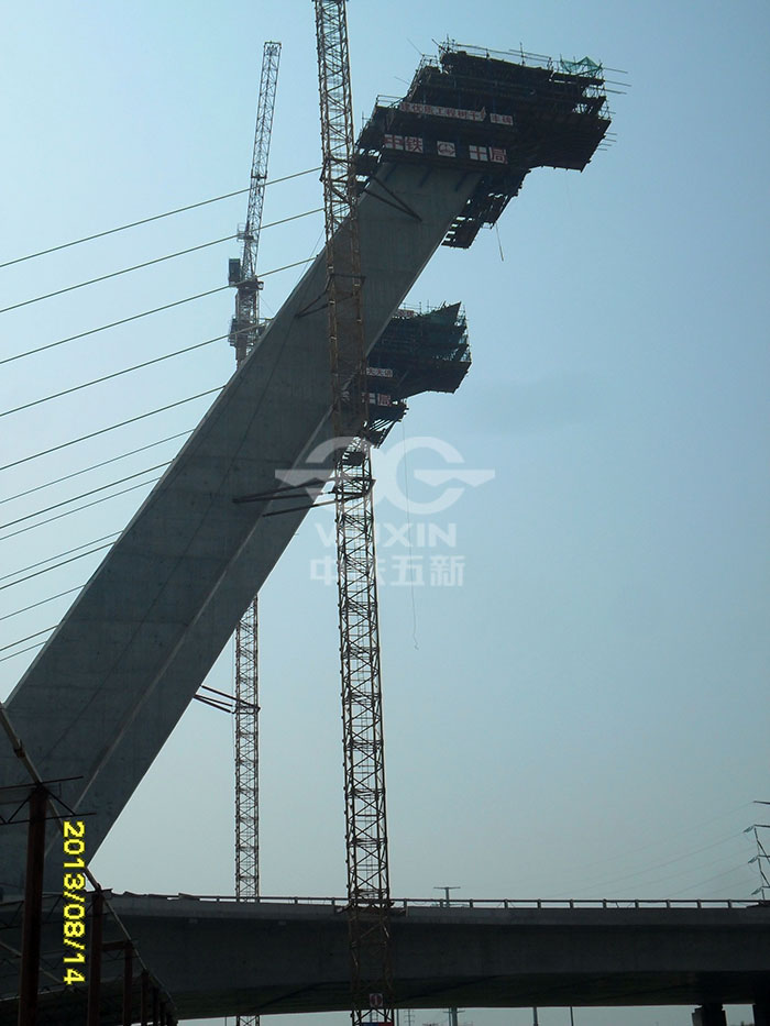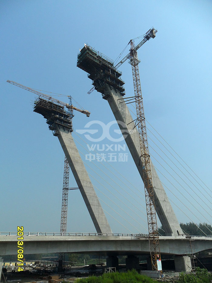 工程亮点或工程难点:主塔为独柱式钢筋混凝土斜塔,倾斜角30°,主桥为4跨无背索斜拉桥