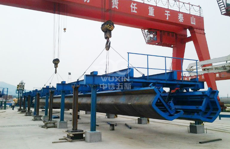 外模:结构牢靠,安装、调试快捷方便;采用激光切割下料,成型精度高、侧模通过调整底部千斤顶和螺旋撑杆来保证外形尺寸及标高,同时在地面与侧模之间设置斜撑杆,在保证梁体外形尺寸的同时还能有效的防止模板上浮。